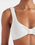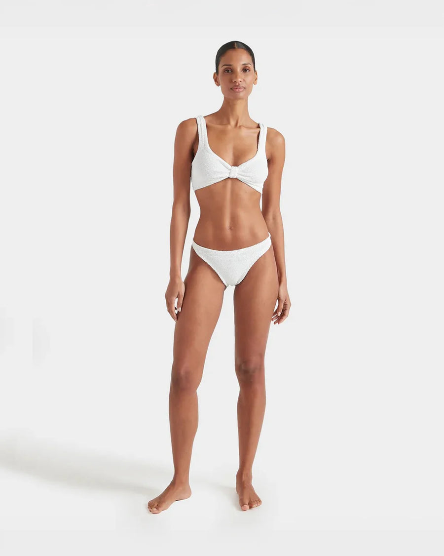 The Bonnie Bikini in White by Hunza G is a retro inspired bikini featuring a top with gathered bow-effect and bottoms with a deeper waist.