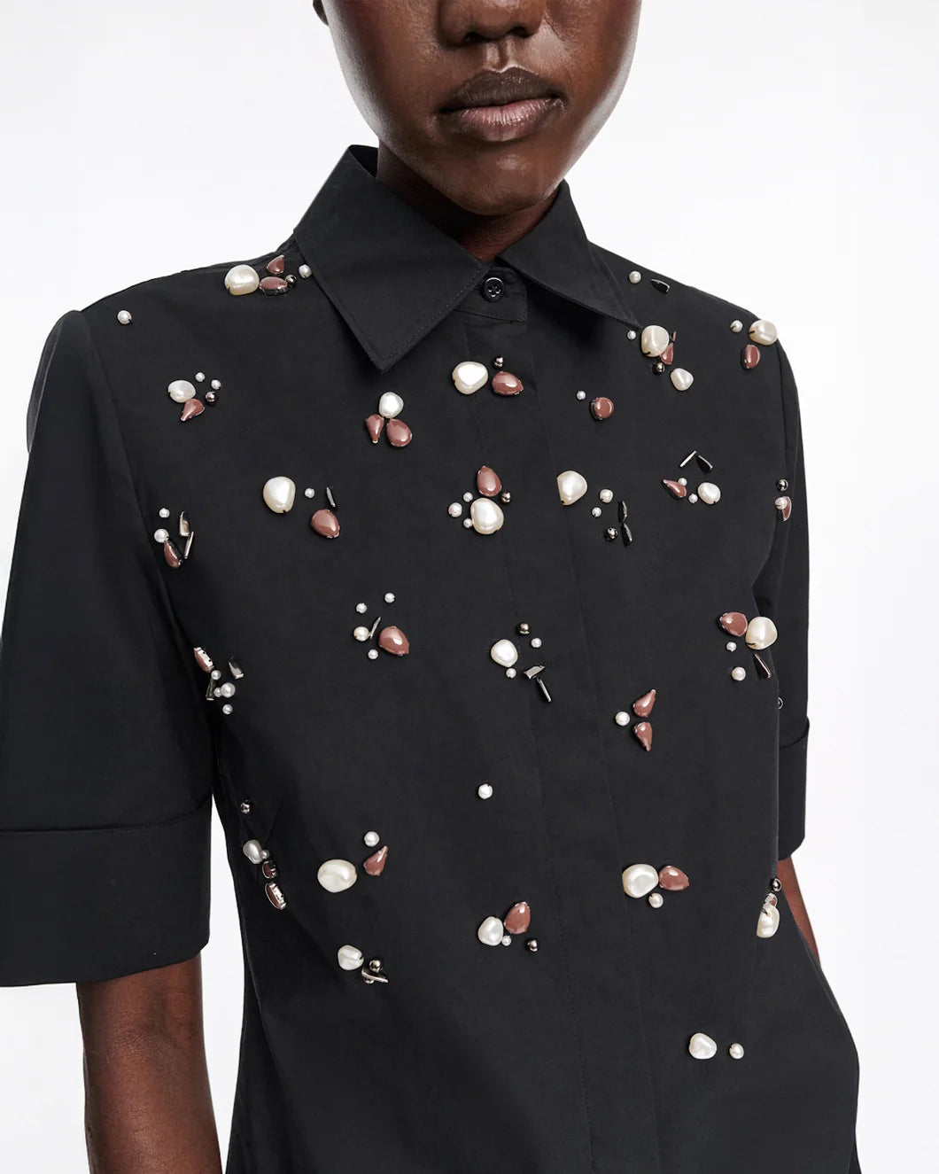 Dorothee Schumacher Poplin Power Blouse in black cotton poplin with pearl and crystal embellishment, classic collar, half sleeves, and turned-up cuffs