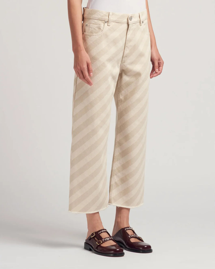 The 5-Pocket Denim Trouser in Bone by Marni is a boyfriend fit, low-waisted jean featuring a straight leg, leather back label with red logo, and metal logo detail on the side crafted in a striped washed denim.