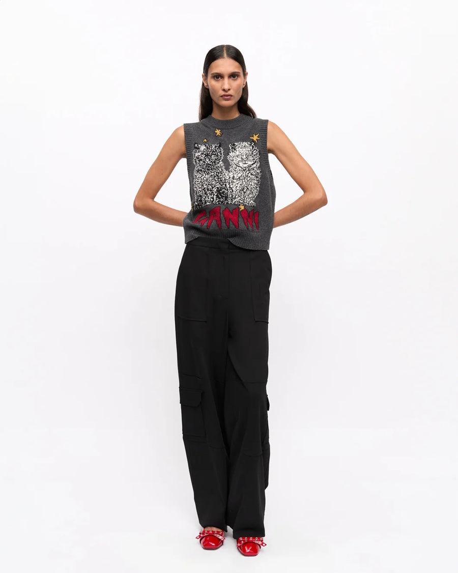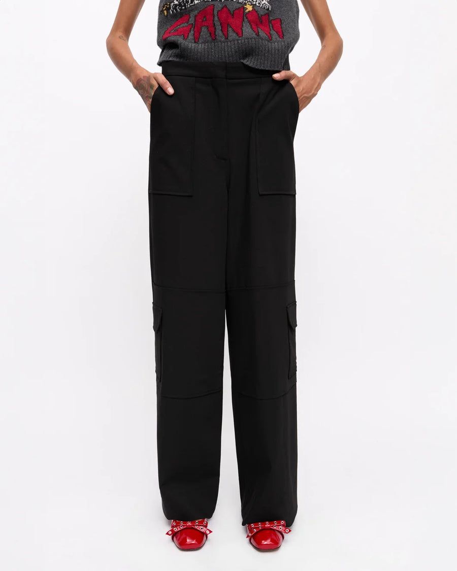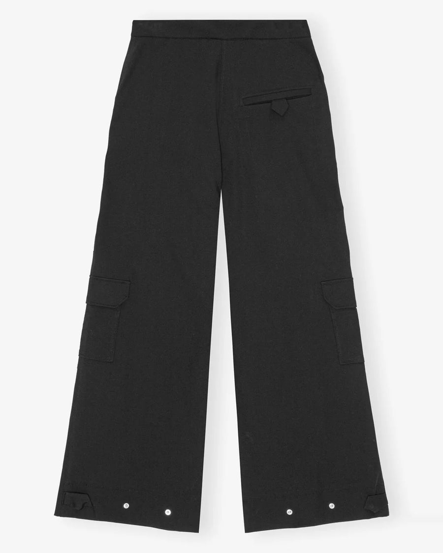 The Black Twill Suiting Cargo Pants by Ganni are a straight leg trouser featuring large front patch pockets, side cargo pockets, and a snap button at the hem for an adjustable fit.