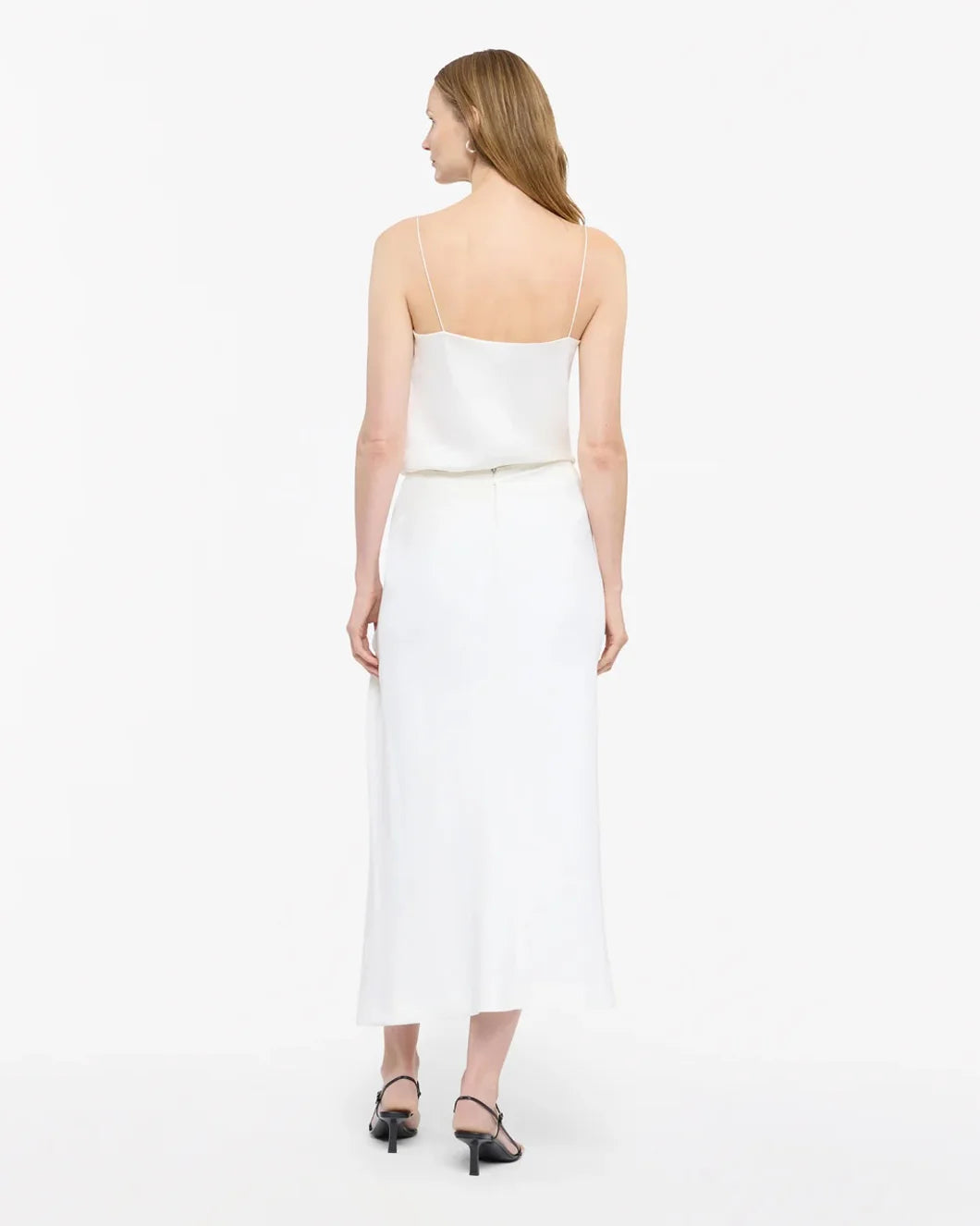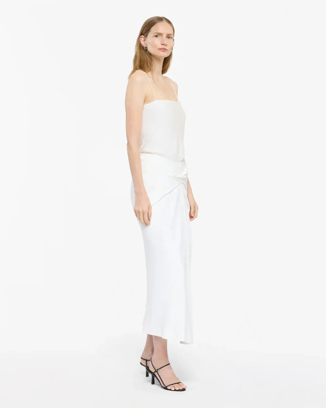 The Asymmetrical Twist Skirt in Off White is an a-line, fluid skirt featuring an asymmetrical hem and intricate twisting and draping at the waist crafted in a fluid heavy-weight crepe.