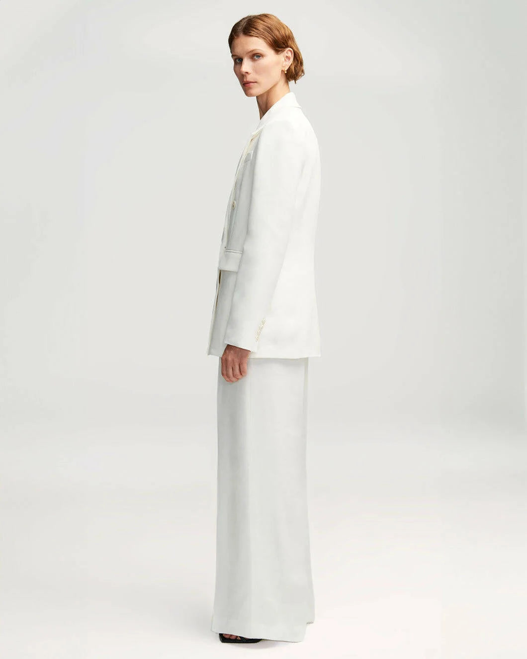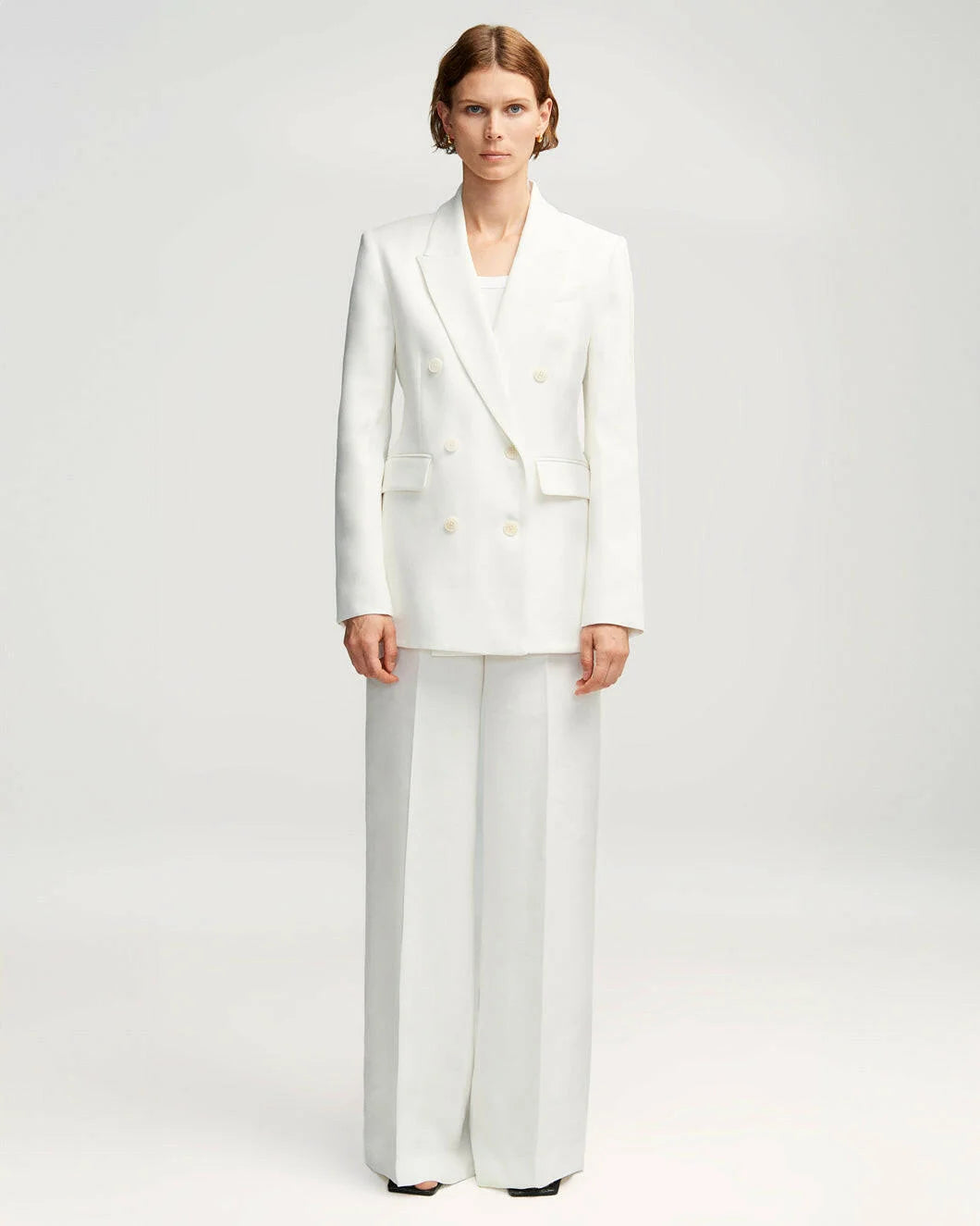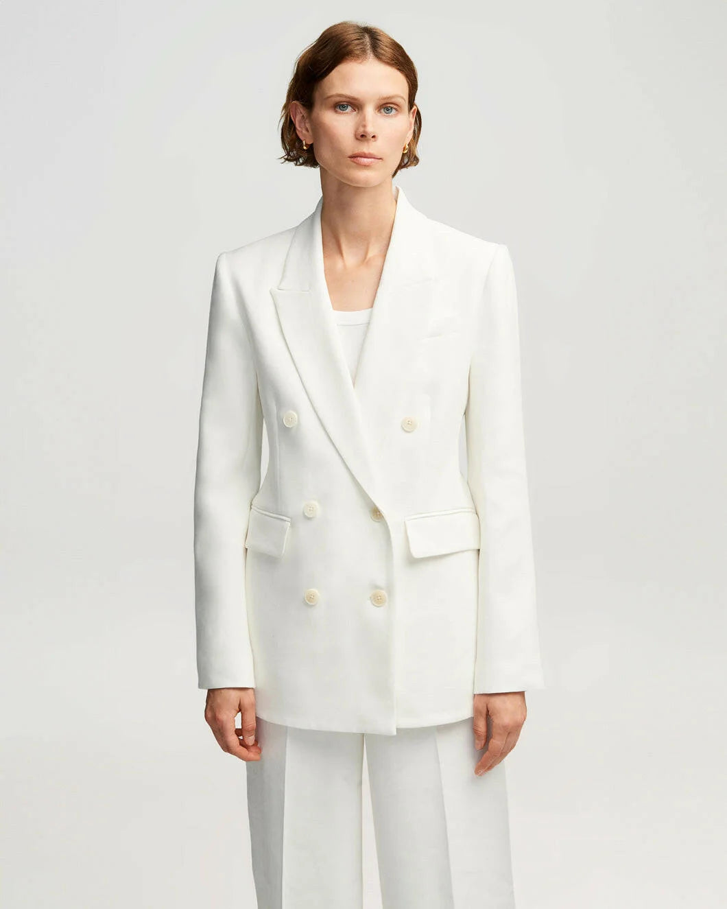 El blazer cruzado en marfil de Argent es una chaqueta llamativa que presenta una solapa de pico y hombros esculpidos confeccionados en sarga de grano texturizado.