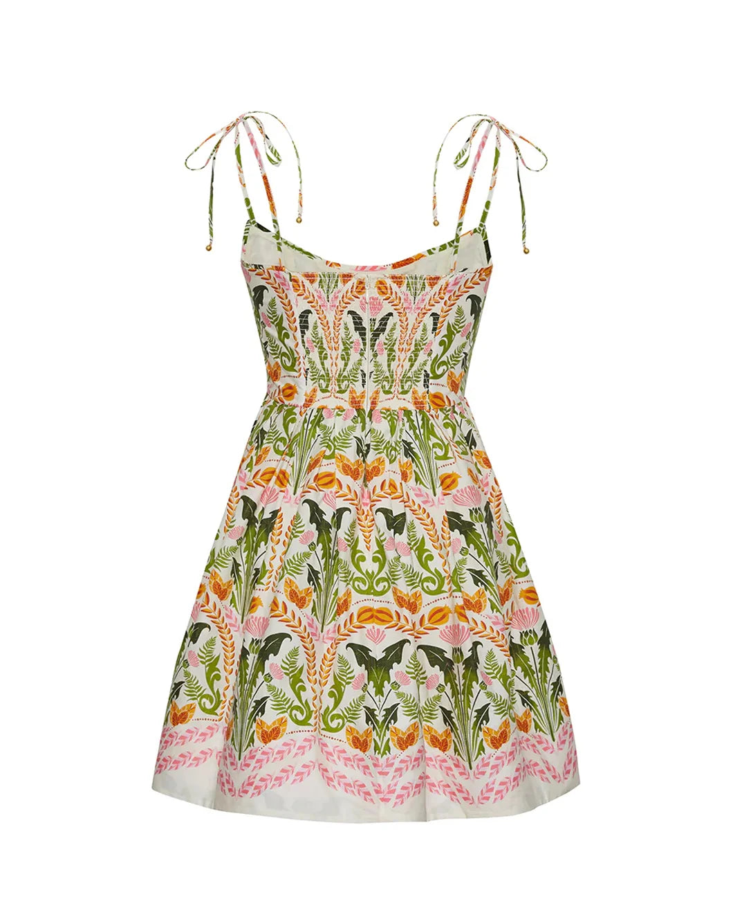 The Laia Dress in Juniper Egret by Cara Cara is a mini fit-and-flare dress featuring functional ties at the shoulders, center back smocking, and shirring at the waist.