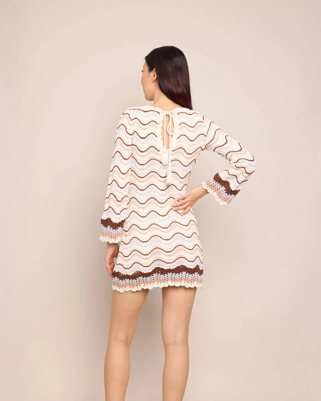 The Landon Dress in Ivory Wave Multi Crochet by Cara Cara is a reversible boat neck mini dress featuring a flared sleeve, hand crochet trims, and a tieback keyhole detail with tassels.