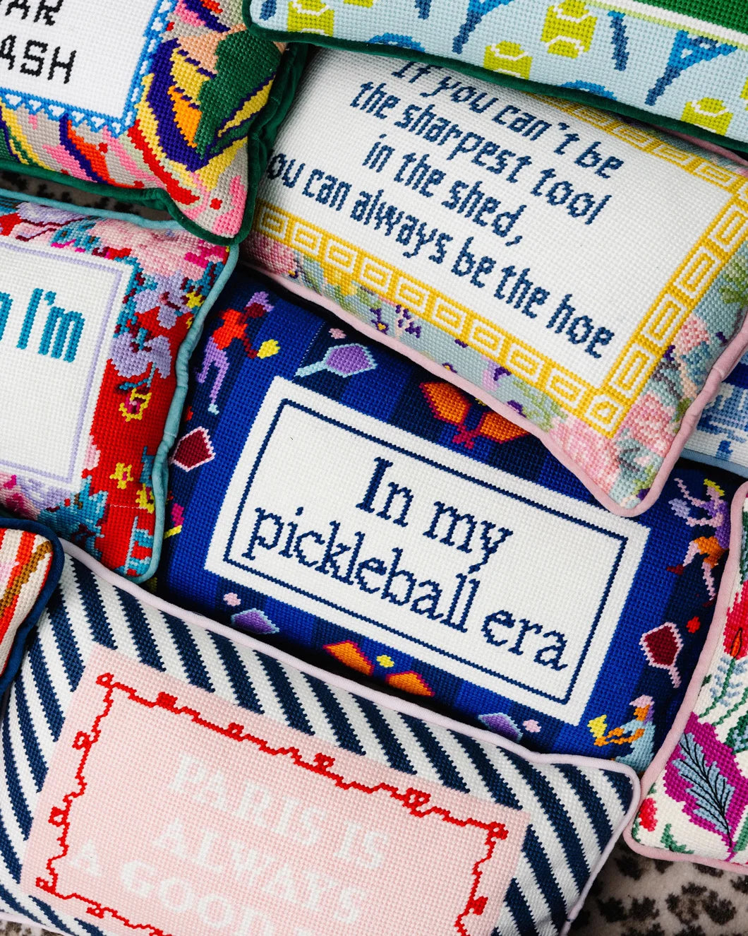 The Pickleball Era Needlepoint Pillow by Furbish Studio is a playfully embroidered throw pillow backed in luxe velvet.