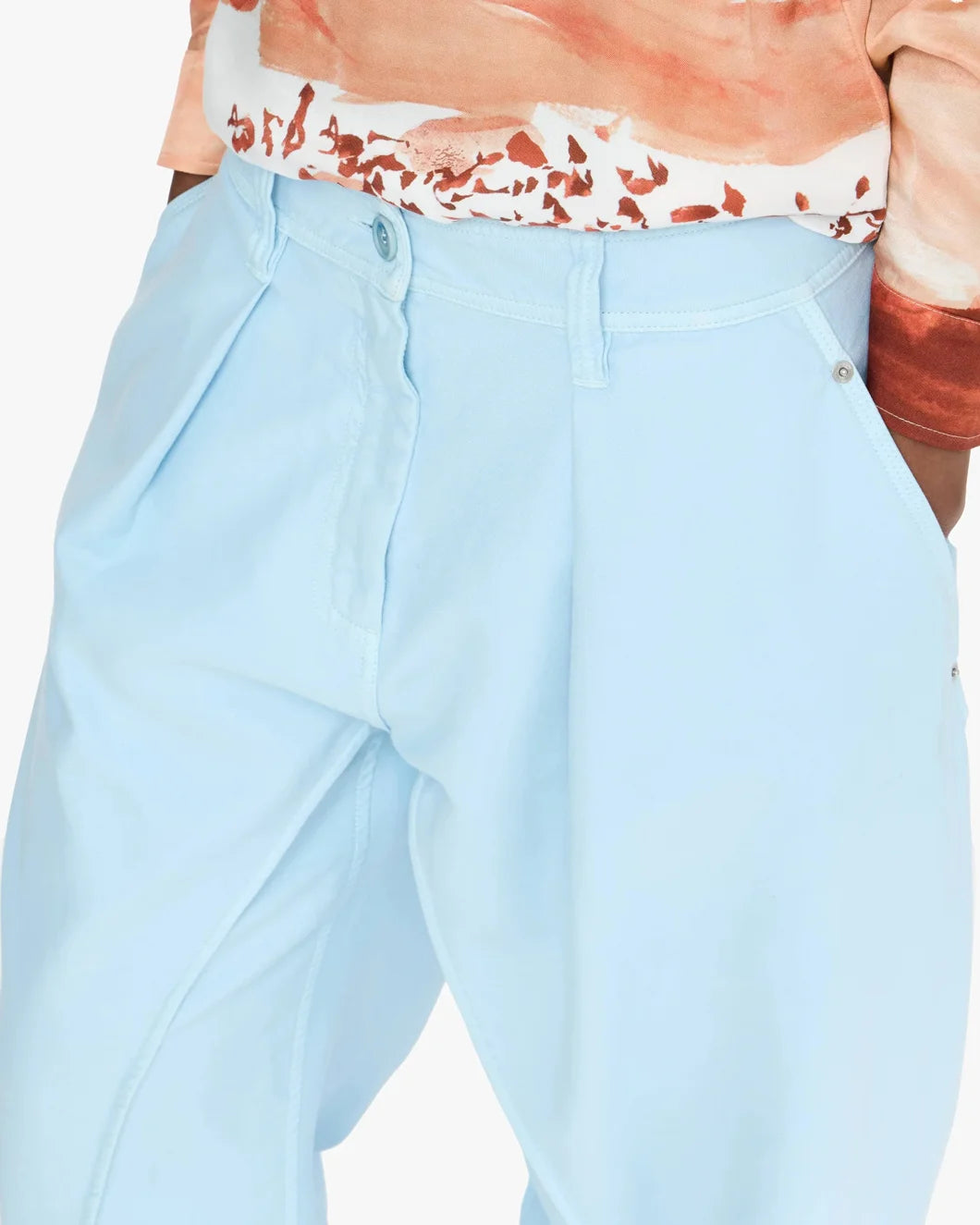 The Twisted Seam Trousers in Pale Blue by JW Anderson is a relaxed fit, twisted silhouette trouser featuring curved seams, carpenter loop, and front patch pocket with tonal anchor profile stitch.